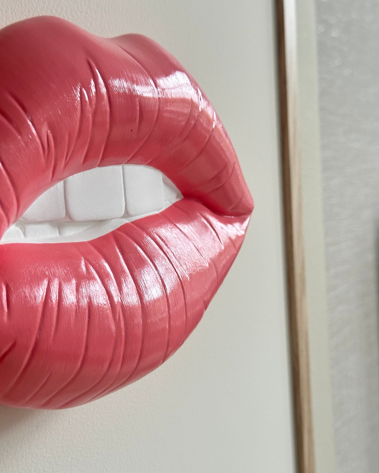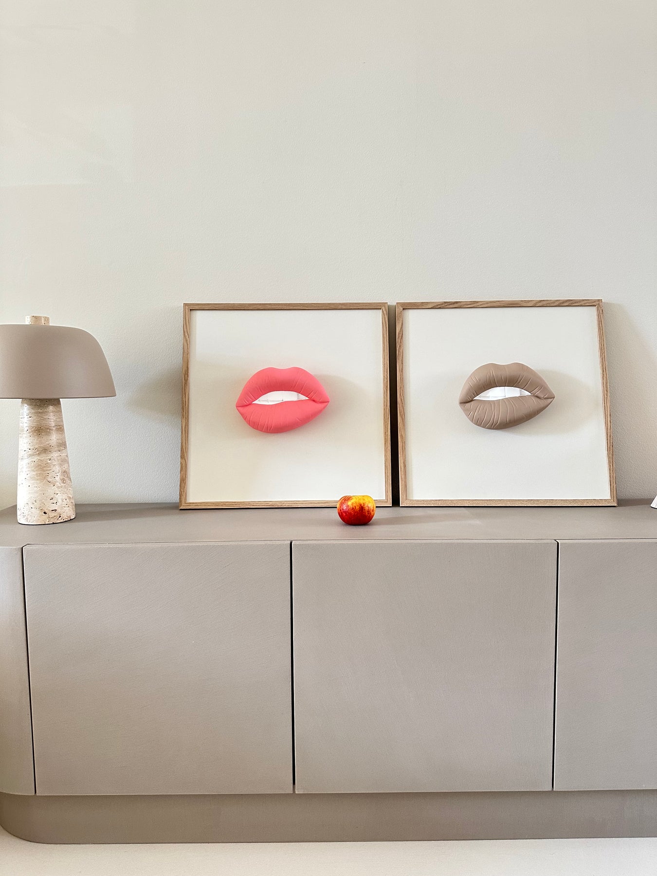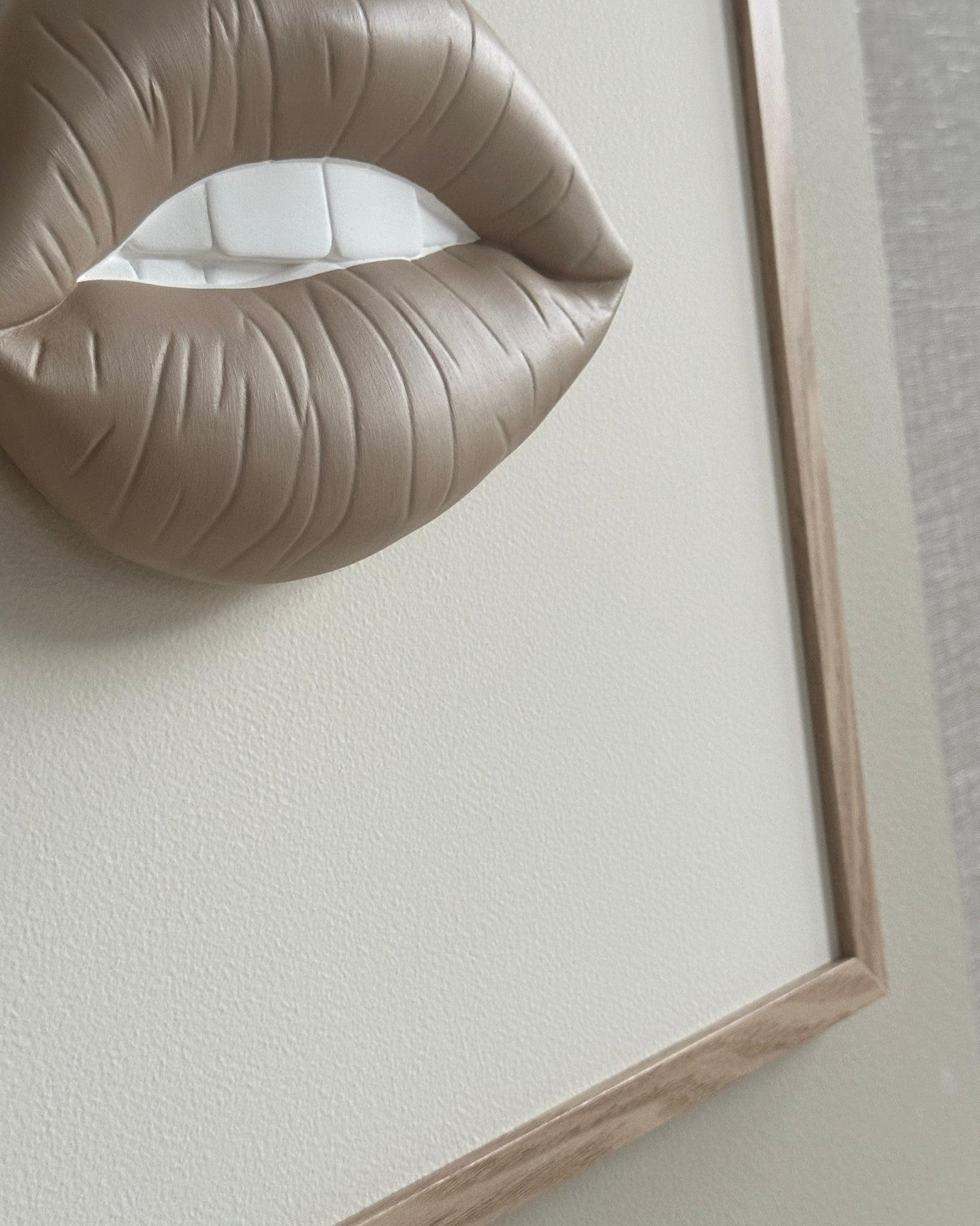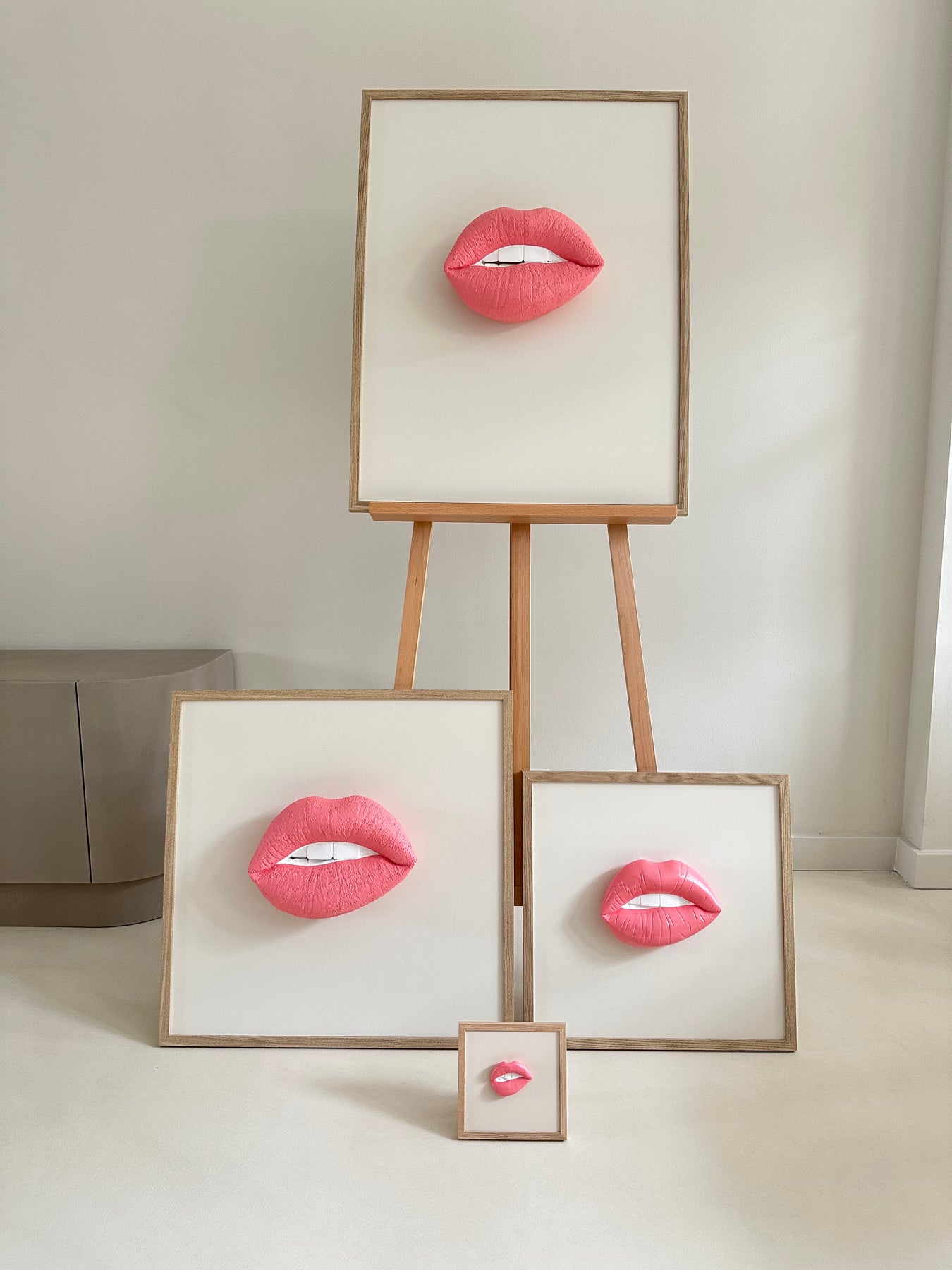 Let op: dit artwork in maat M is op voorraad met 3D monden in deze kleuren : roze glossy, taupe mat & rood glossy met het paneel in beige (slipper satin) en een licht eiken lijst. Alle andere kleuren kun je online bestellen en maak ik op maat voor je. Op dit moment is de levertijd voor maatwerk 3 weken.