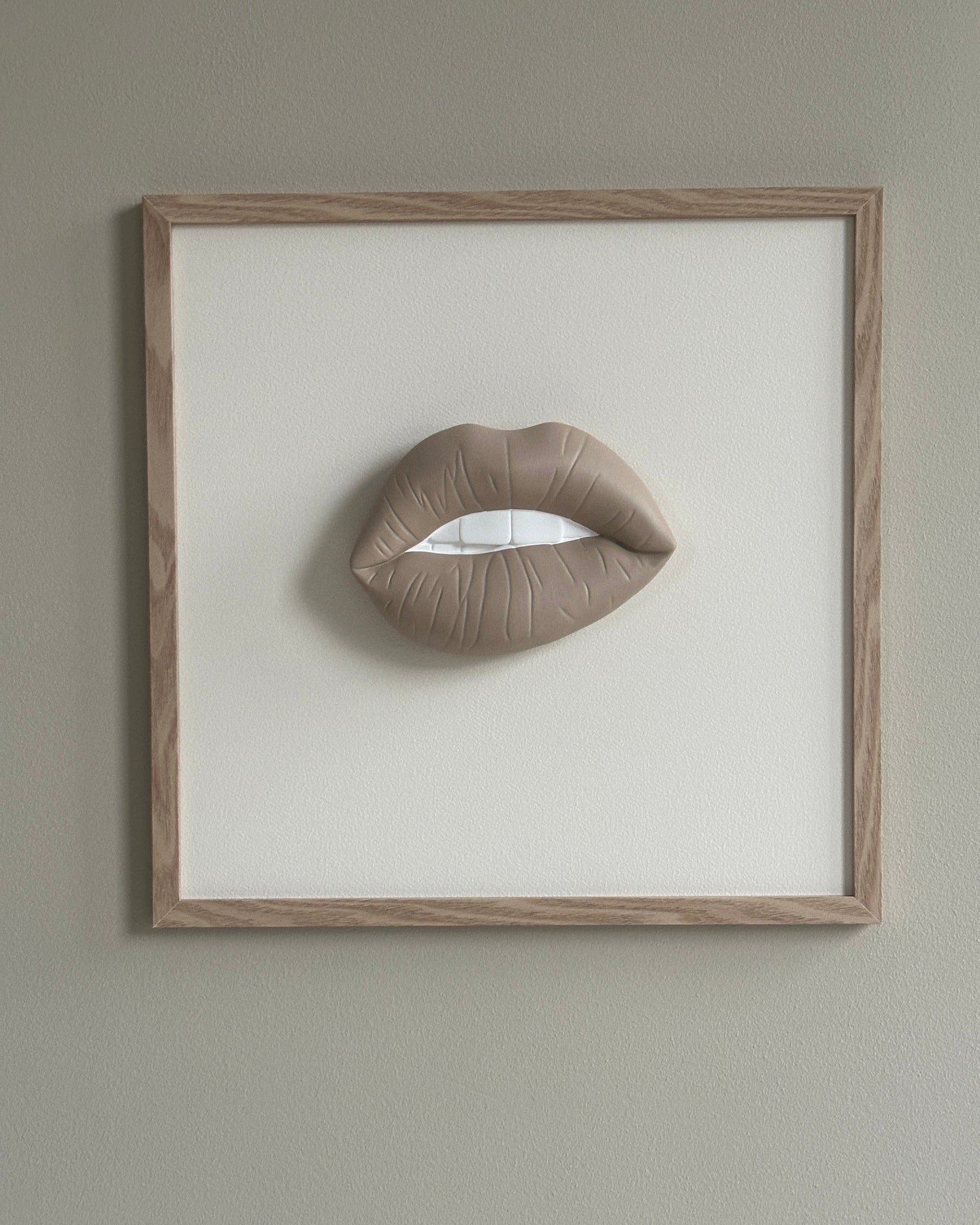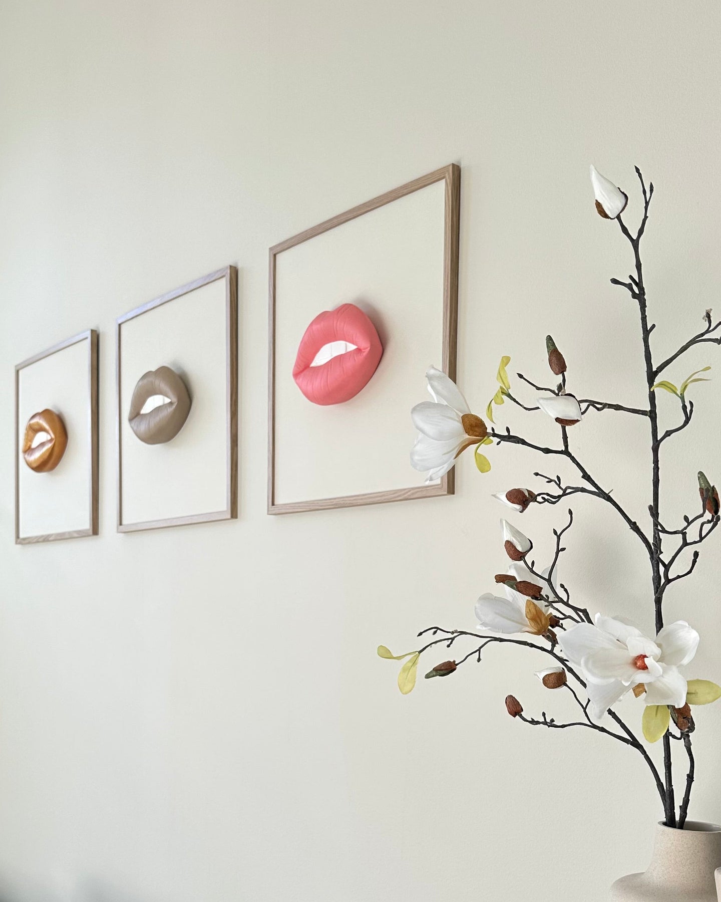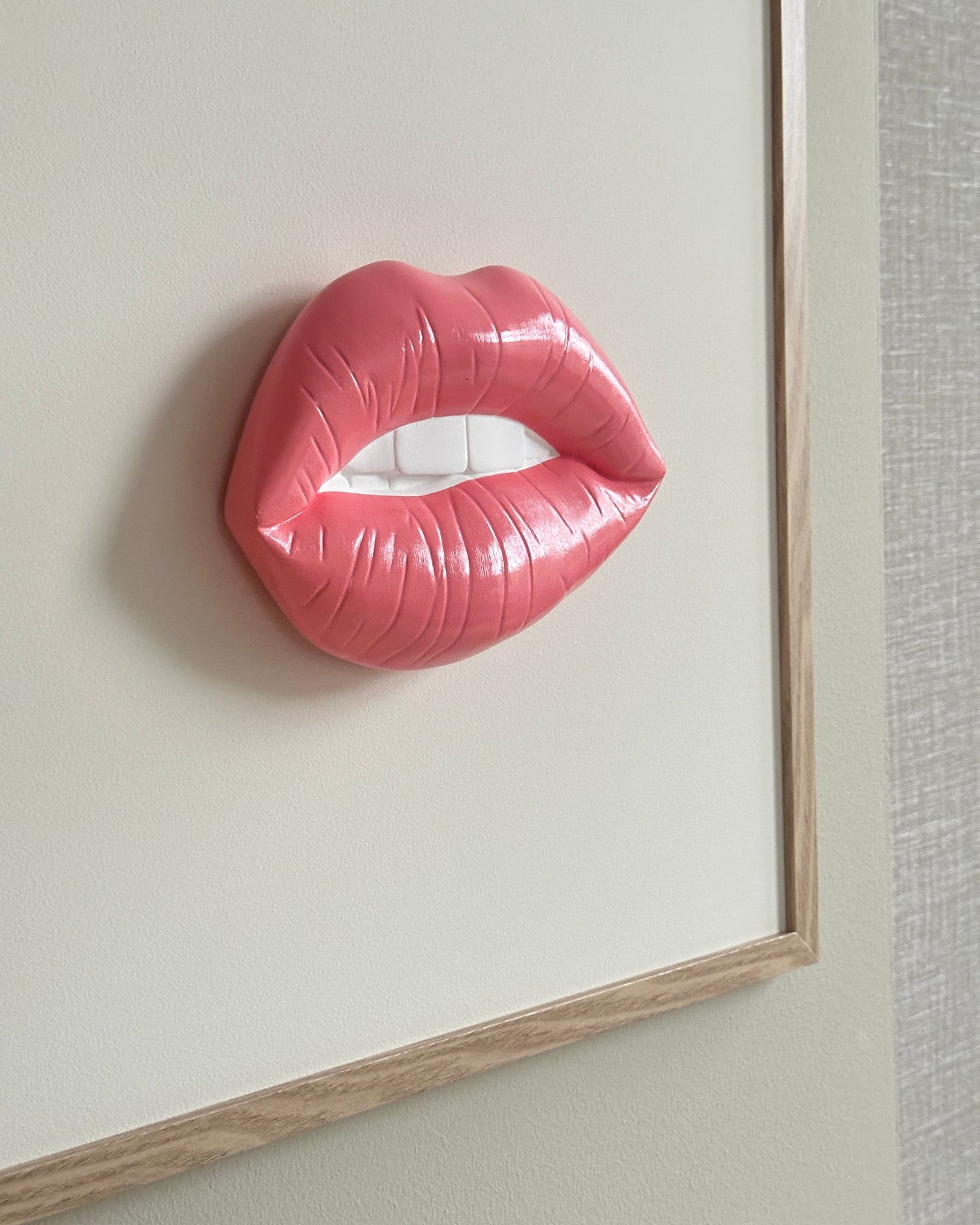 Let op: dit artwork in maat M is op voorraad met 3D monden in deze kleuren : roze glossy, taupe mat & rood glossy met het paneel in beige (slipper satin) en een licht eiken lijst. Alle andere kleuren kun je online bestellen en maak ik op maat voor je. Op dit moment is de levertijd voor maatwerk 3 weken.