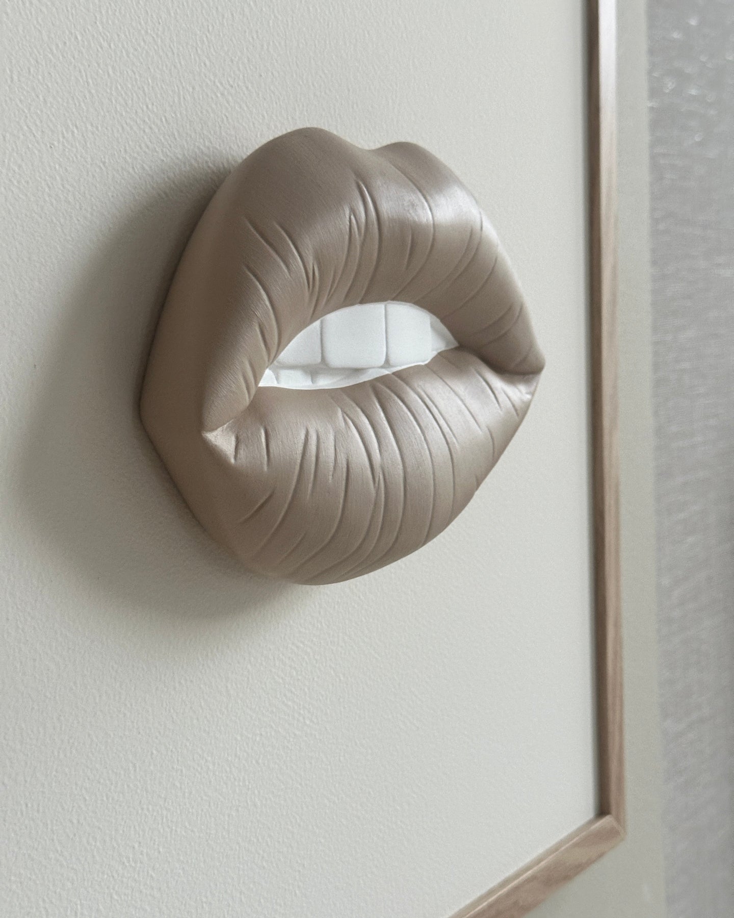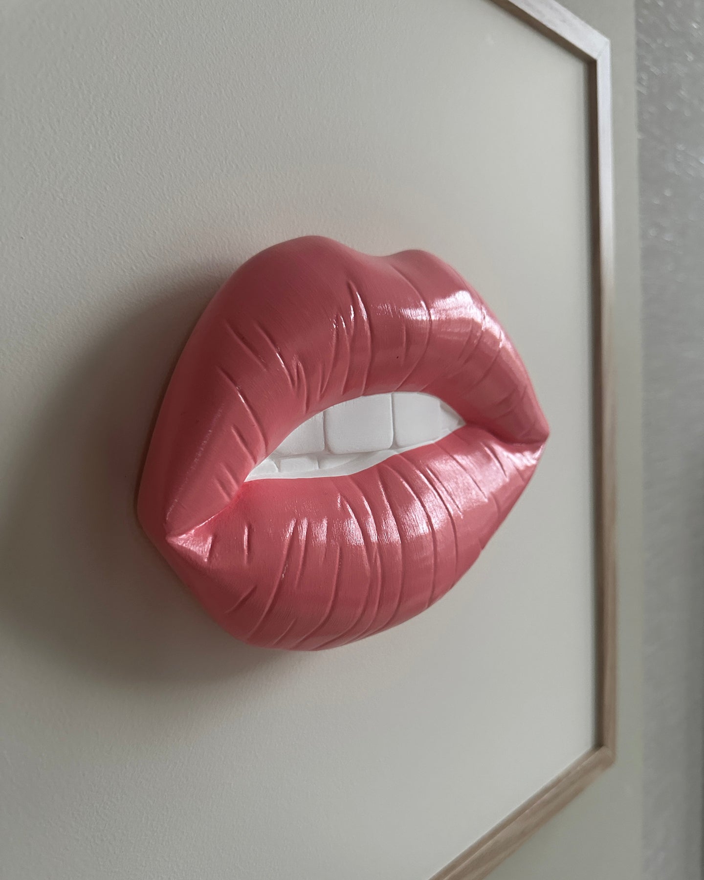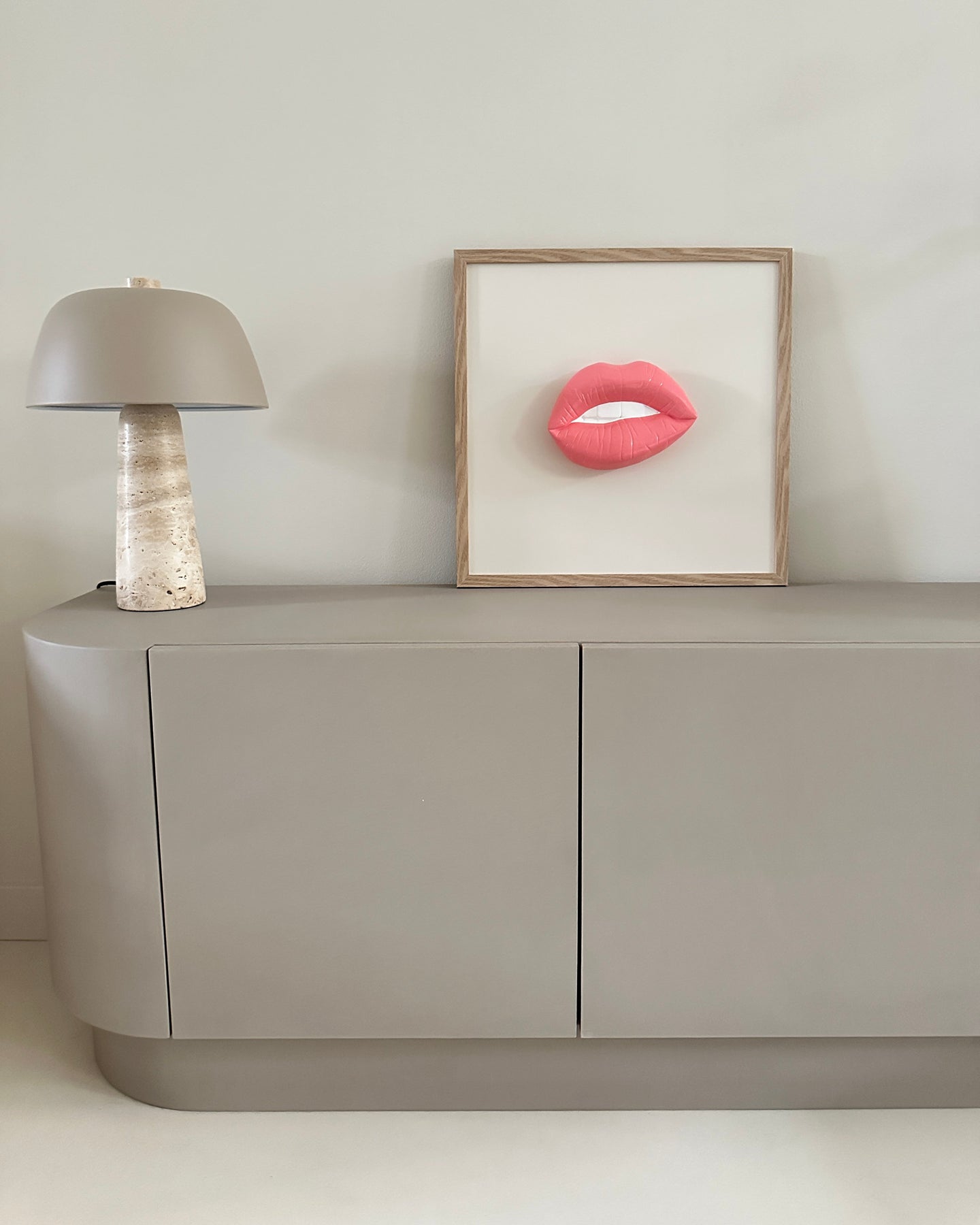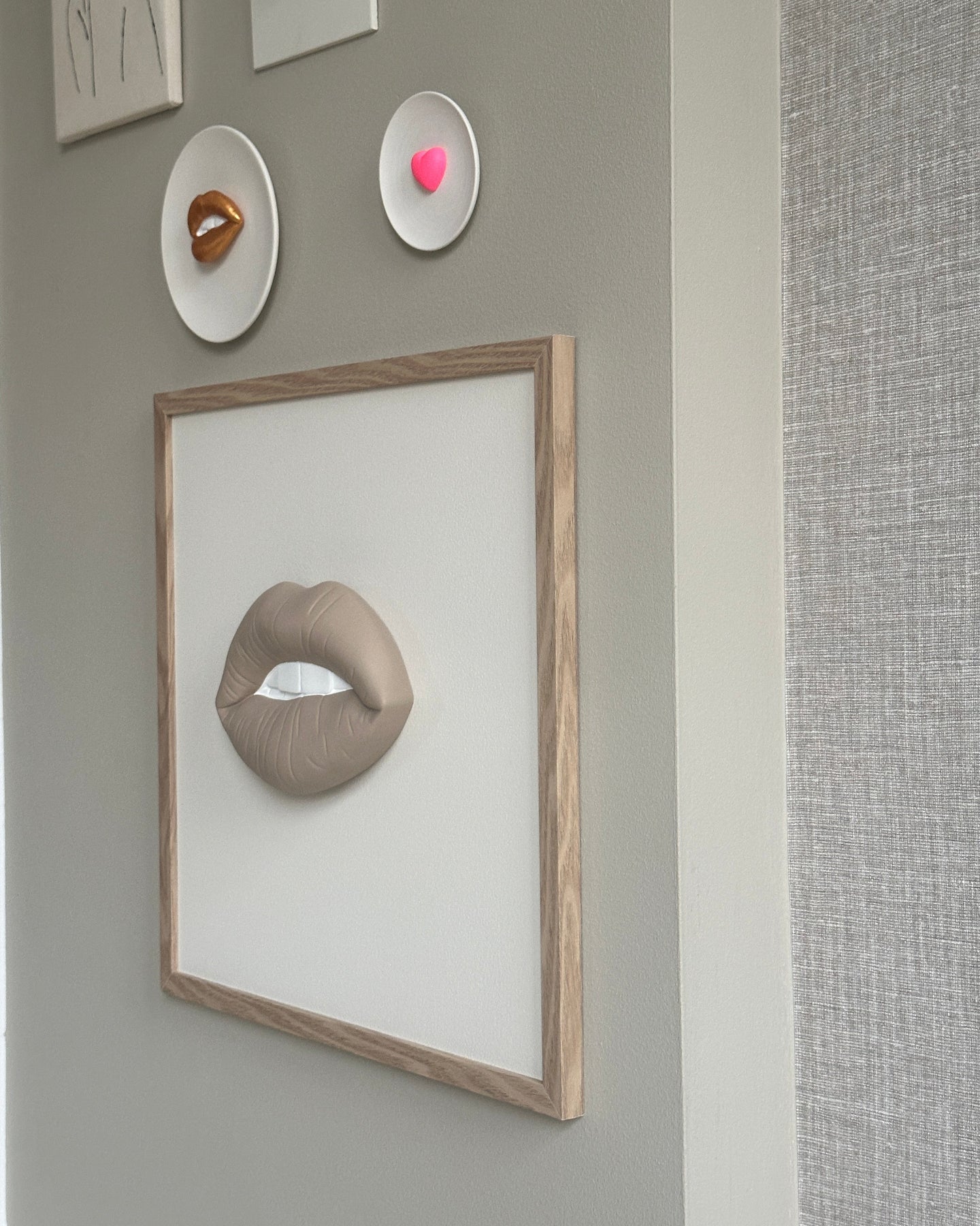 Let op: dit artwork in maat M is op voorraad met 3D monden in deze kleuren : roze glossy, taupe mat & rood glossy met het paneel in beige (slipper satin) en een licht eiken lijst. Alle andere kleuren kun je online bestellen en maak ik op maat voor je. Op dit moment is de levertijd voor maatwerk 3 weken.