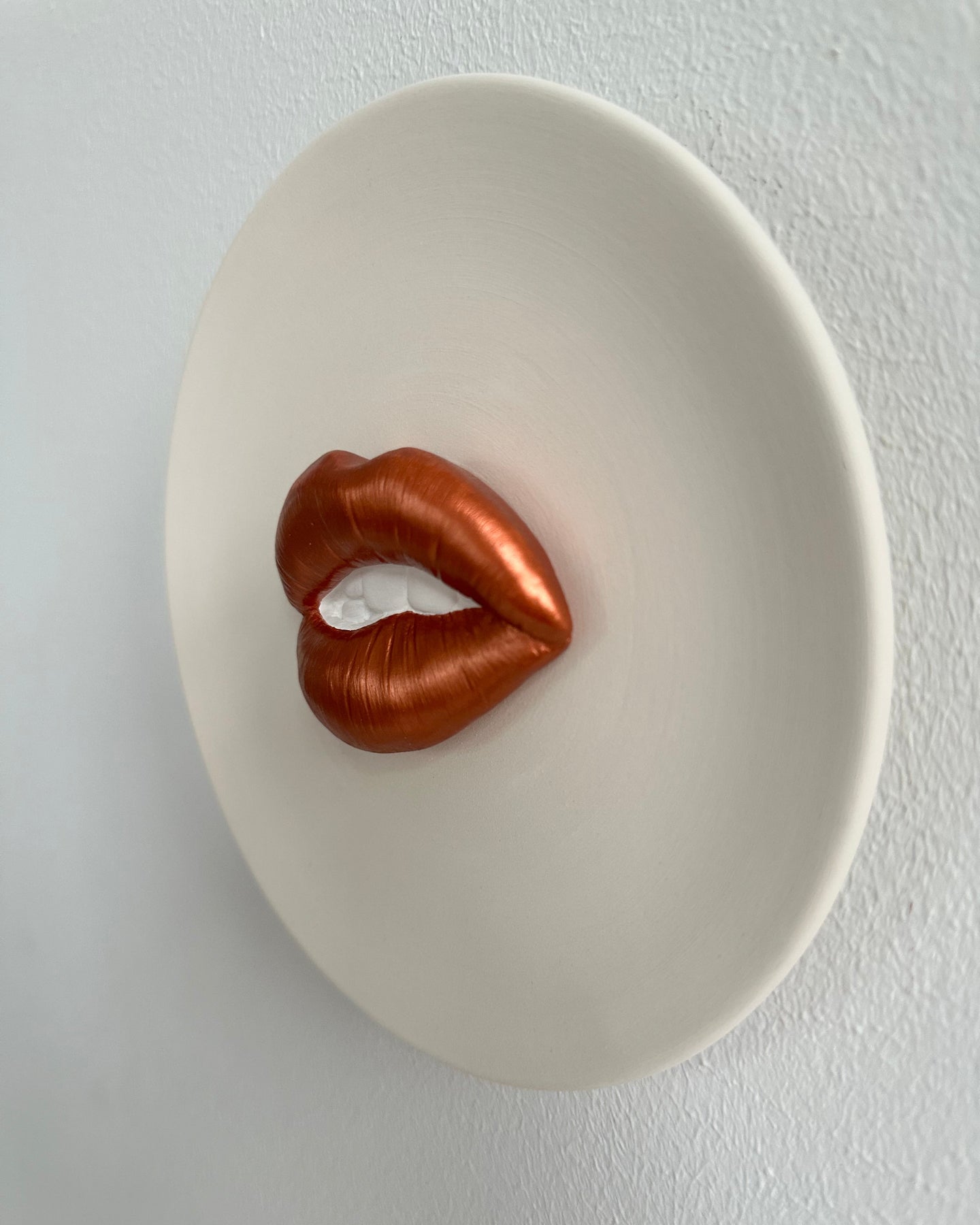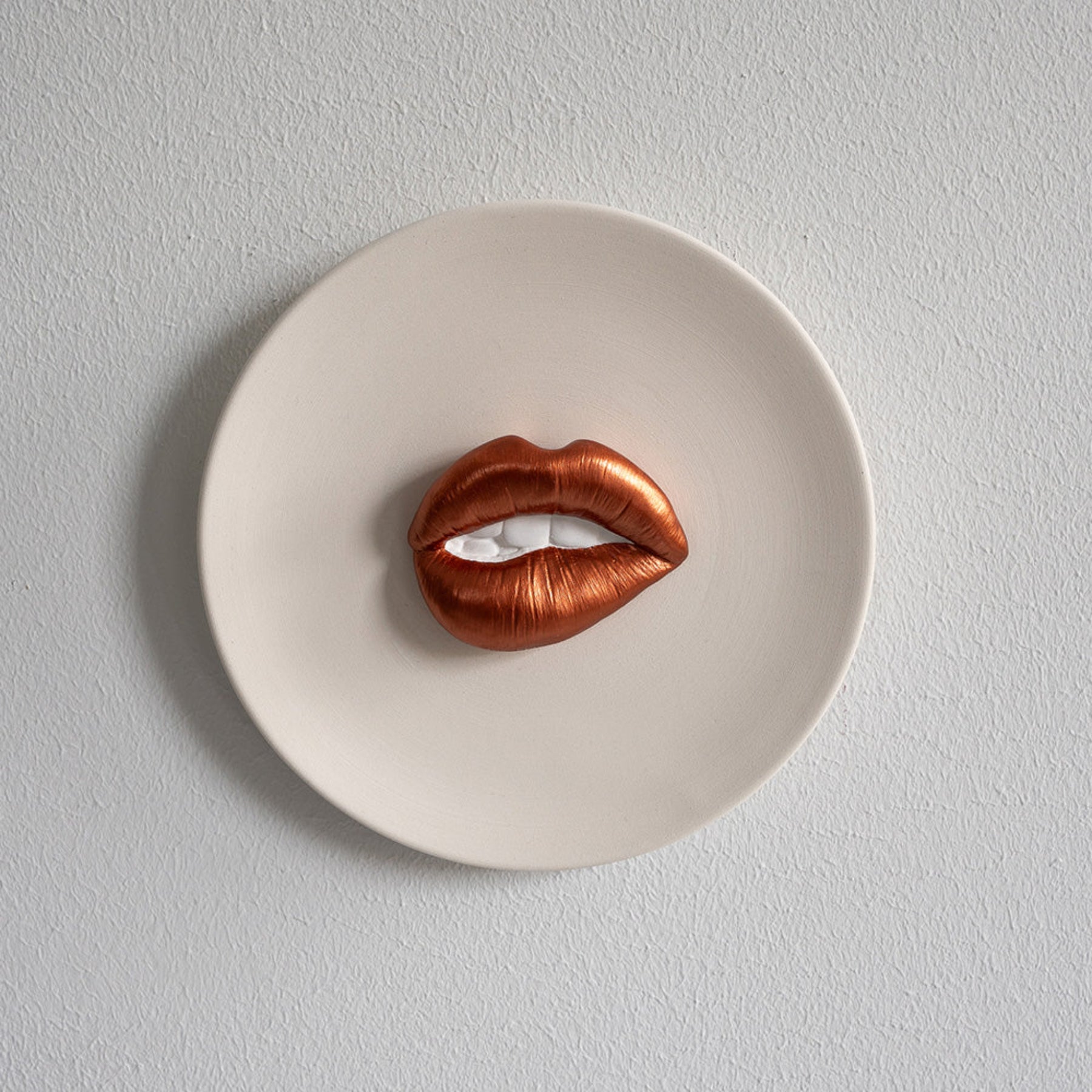 Dit keramieken bordje met een 3D-mond in glossy koper is een mooi en stijlvol kunstwerk voor aan de muur. Elk mondje wordt in mijn atelier handgemaakt en zorgvuldig met de hand beschilderd. De combinatie van het zachte off-white keramiek en de glanzende koperen lippen maakt dit item een echte blikvanger die warmte en een knipoog toevoegt aan jouw interieur.