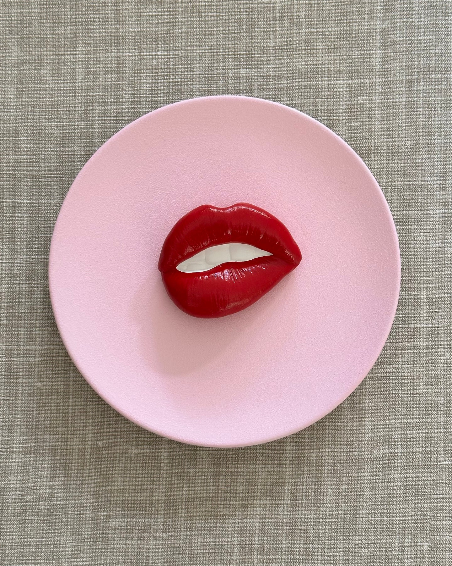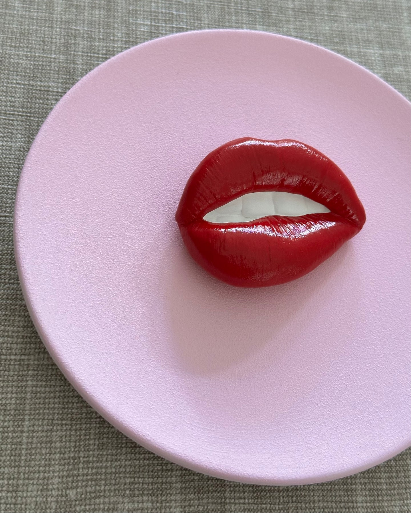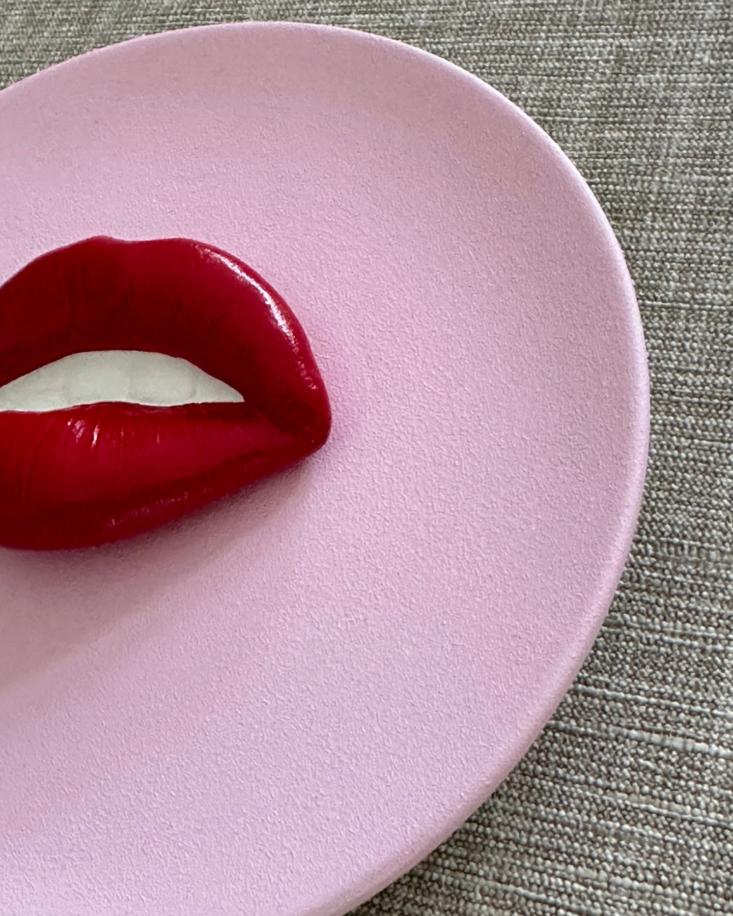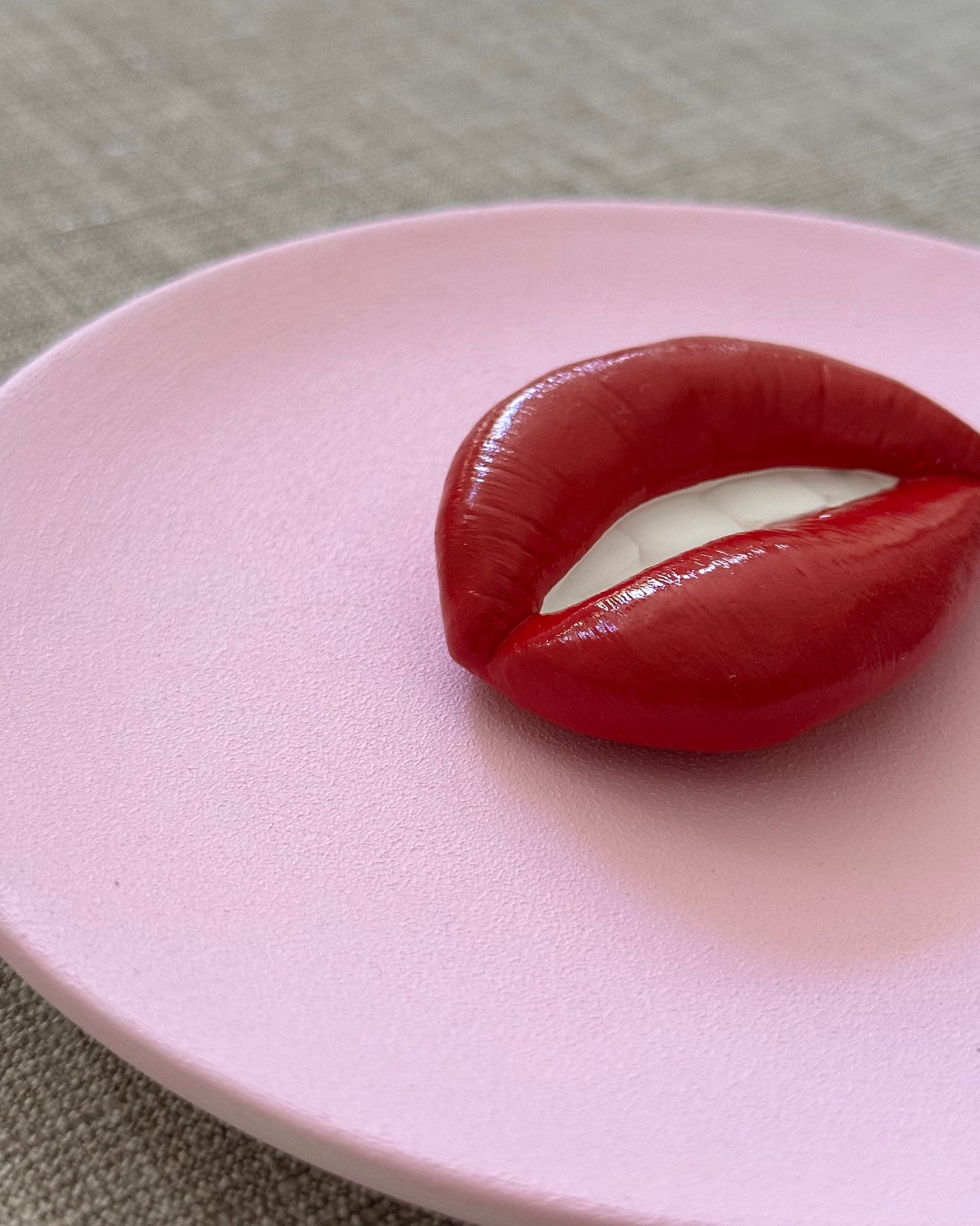 Keramieken bord licht roze met rode 3D mond – 16 cm handgemaakt
