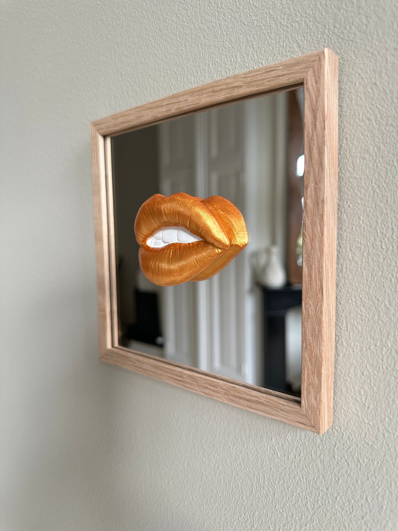 Spiegel tegel met handgemaakte 3D mond goud - inclusief licht eiken lijstje